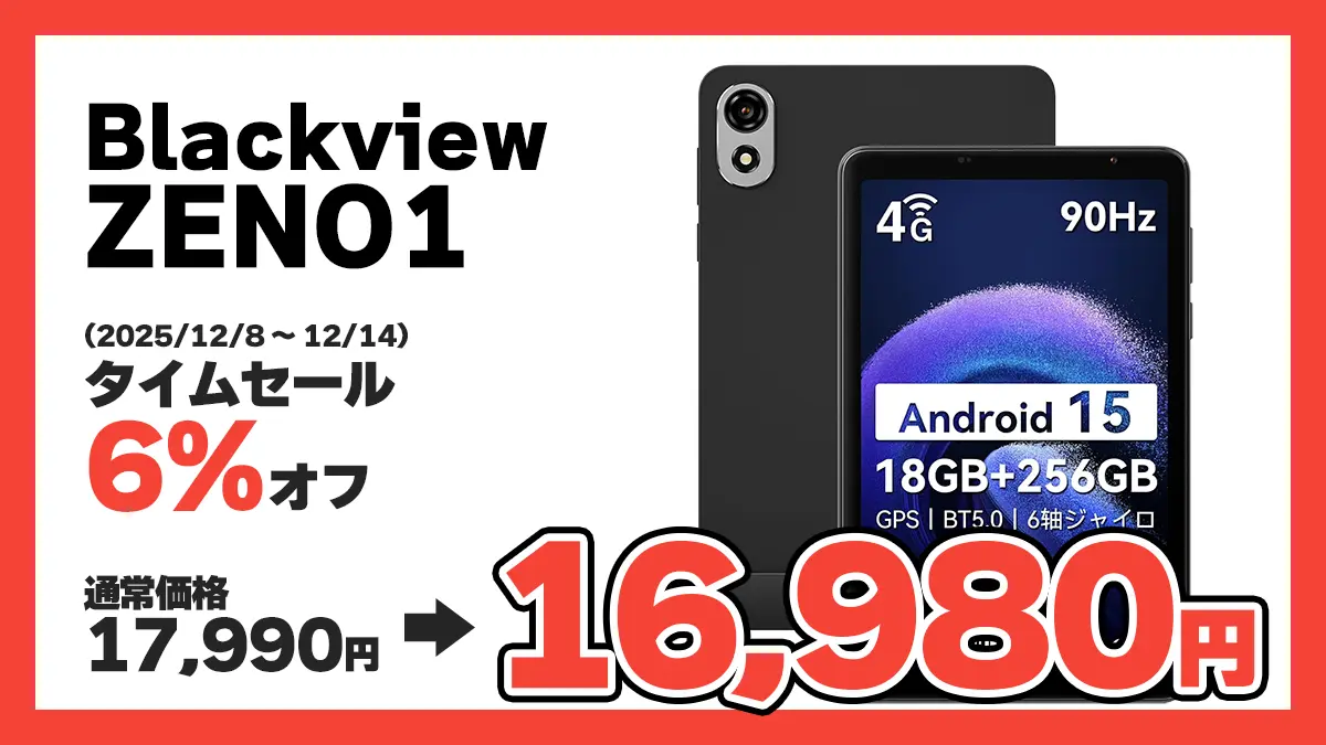 Blackviewの8.4インチタブレット「Blackview ZENO1」がAmazonにてセール中です。通常価格は17,990円ですが、12月14日まではタイムセールで6%引きの16,980円で購入できます。