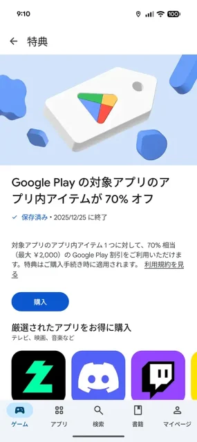 Google Playストアの特典で「Google Play の対象アプリのアプリ内アイテムが 70% オフ」というものが表示されました。ただし、「購入履歴に基づいて選ばれた一部の方のみが対象」となります。