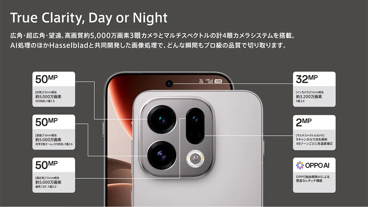 OPPO Find X9の背面カメラは約5,000万画素の3つの高画質カメラとマルチスペクトルカメラの計4眼カメラを搭載します。広角・超広角・望遠すべてに大型センサーを搭載したこれらのカメラはFind X8に引き続きスウェーデンの名門カメラメーカーHasselbladとの共同開発です。