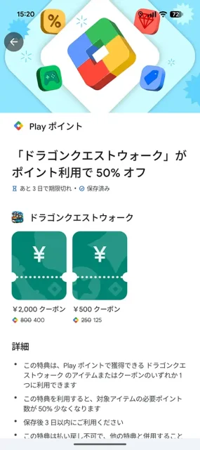 この特典はPlayストアの通知やPlayポイントのページで表示されています。全員が対象というものでもないと思いますが。おそらく普段プレイしてるゲームなりアプリの特典が対象となっていて、私の場合は『ドラゴンクエストウォーク』のクーポンが半額というものでした。