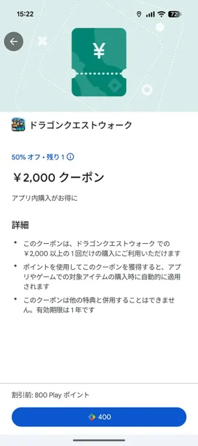 これはPlayポイントで交換できる特典のことで、私の場合は『ドラゴンクエストウォーク』のクーポンが対象でした。(おそらく人によって対象となるアプリが異なる。)おかげで通常800ポイントの2,000円分クーポンを400ポイントで交換できました。