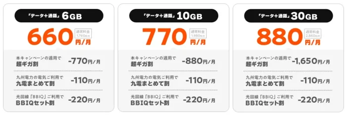 今回のキャンペーンでは、期間中に「データ+通話」コースの6GB/10GB/30GBプランを新規または乗換え(MNP)で契約すると利用開始月を含む最大6ヶ月間月額料金が割引されます。割引額はプランによって異なり、30GBプランの場合は1,650円が割り引かれます。