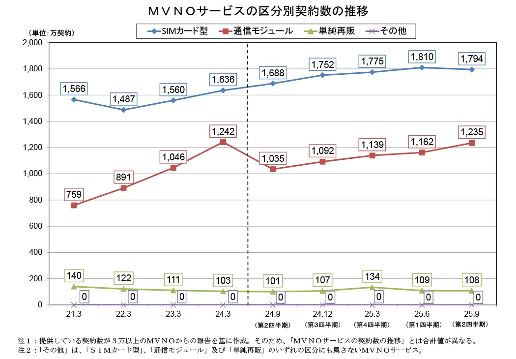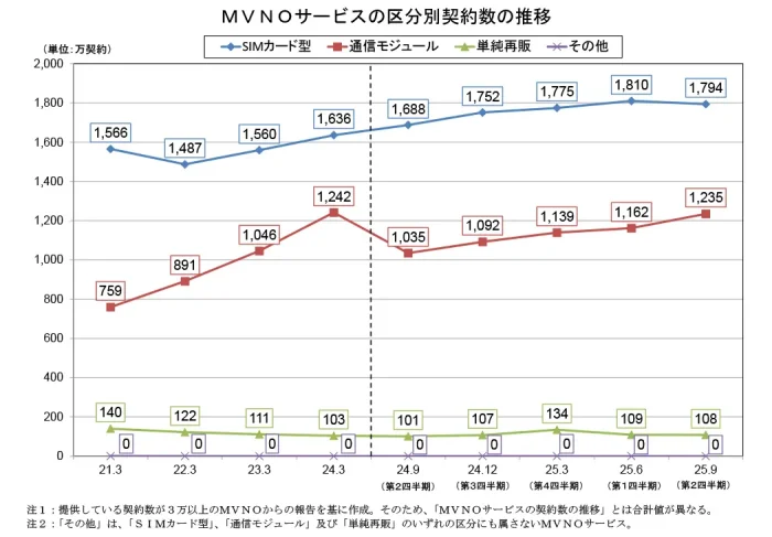 契約数が3万以上のMVNOサービスの区分別契約数は、SIMカード型が1,794万(前期比-0.9%、前年同期比+6.3%)、通信モジュールが1,235万(前期比+6.3%、前年同期比-19.3%)でした。