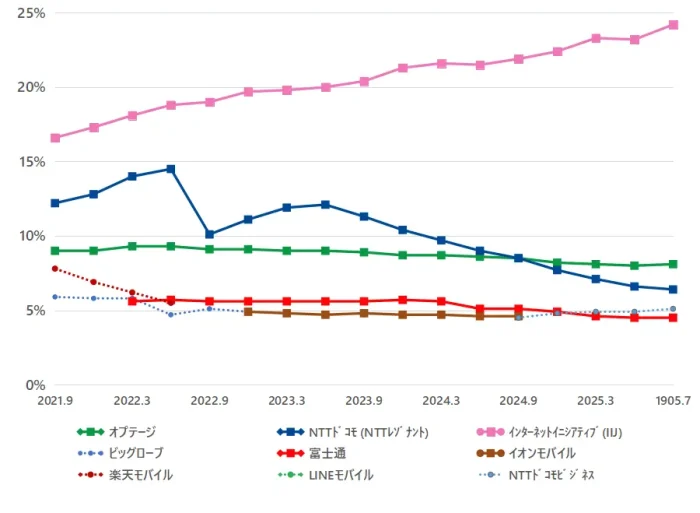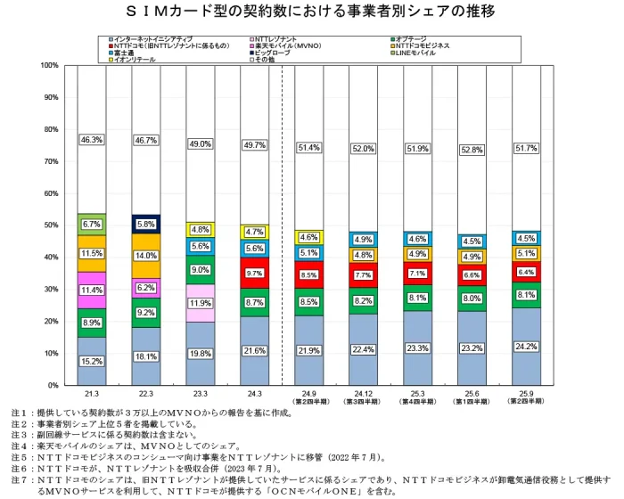 総務省 2025年度Q2(9月末)電気通信サービスのデータ:MVNOサービスのシェアはIIJが24.2%に