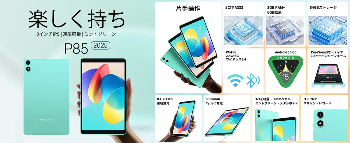 TECLAST P85は最近人気が出てきた8インチ画面のタブレットです。タブレットとしては比較的小型ですが、取り回しもいいですし電子書籍を単ページで読むのにはちょうどいいサイズです。