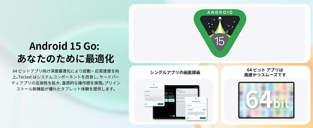 OSアップデートはAndroid 15のGo Editionを搭載します。通常のAndroid 15に比べると低スペック端末向けに軽量化されているので、スペックの割にはしっかり動いてくれると期待できます。