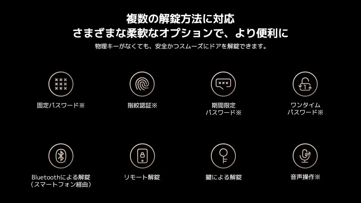 解錠方法は複数あり、スマホ経由のBluetoothやスマートスピーカーの音声操作のほか、指紋認証パッドのセットを購入すれば指紋やパスワードなどでも可能です。