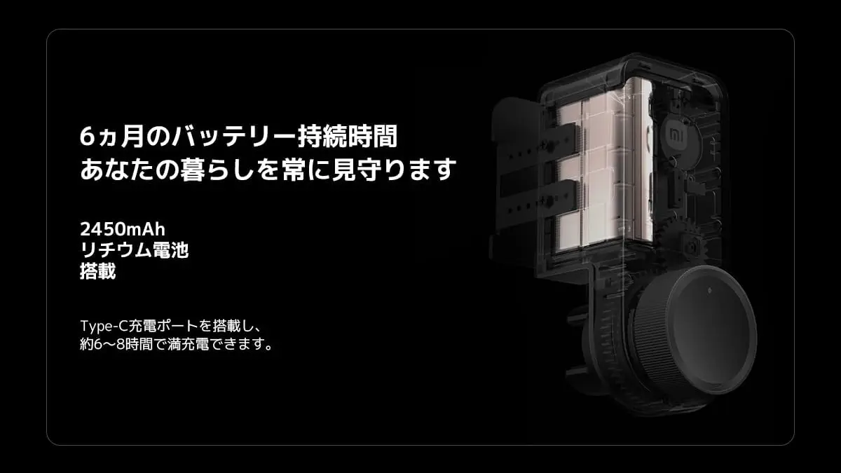 本体のバッテリーは2450mAhのリチウム電池で、約6ヶ月間持続。USB Type-Cポートで充電(約6~8時間)できます。指紋認証パッドはアルカリ単三電池です。