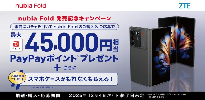 nubia発売記念キャンペーンが行われ、事前抽選を行った上で期間中に購入、専用ページから応募すると、抽選で4万5,000円相当、2万円相当、1万円相当、5,000円相当のいずれかのPayPayポイントがもらえます。