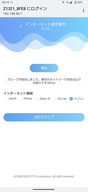 最初にインターネット接続の種類を自動検出してくれたりもします。初心者だとなんのことかわからないかもですが、とりあえず案内にしたがって検出、次のステップと進めばOKです。