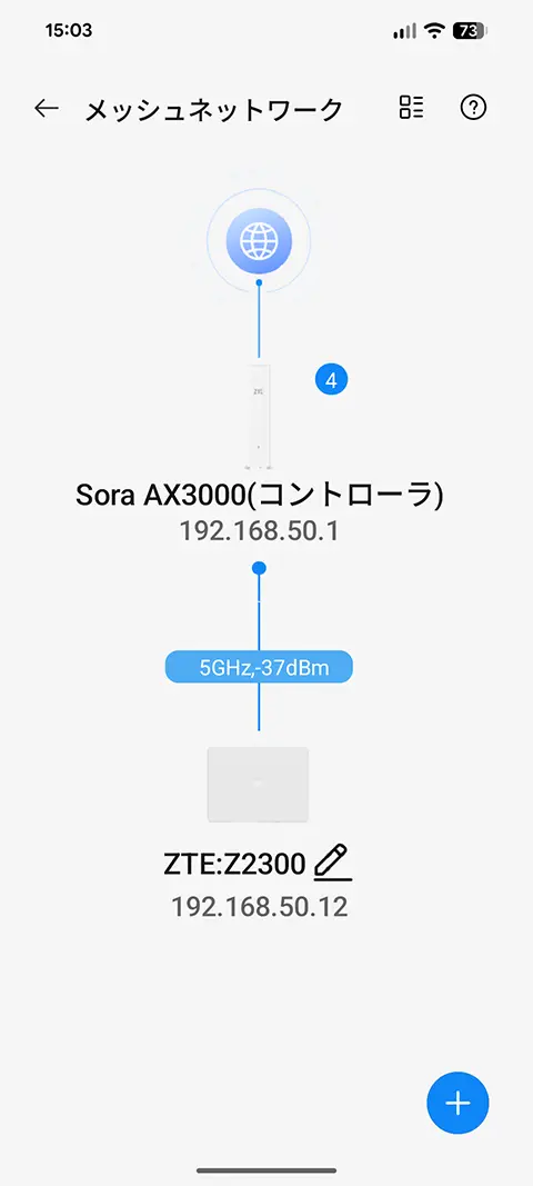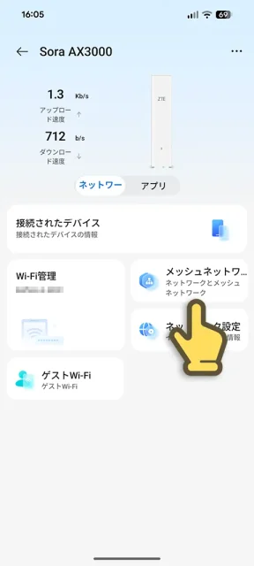 メッシュの構築はアプリから。1台目のルーターのメニューから「メッシュネットワーク」を選んで、あとは案内に従っていけば簡単に追加できます。