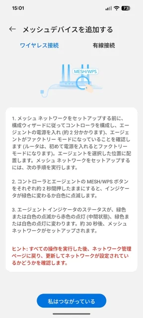 アプリで案内が出たあとに背面にあるMESH/WPSボタンを長押しすれば、あとはデバイスの方で自動的に構築してくれます。簡単すぎて拍子抜けするくらいですね。