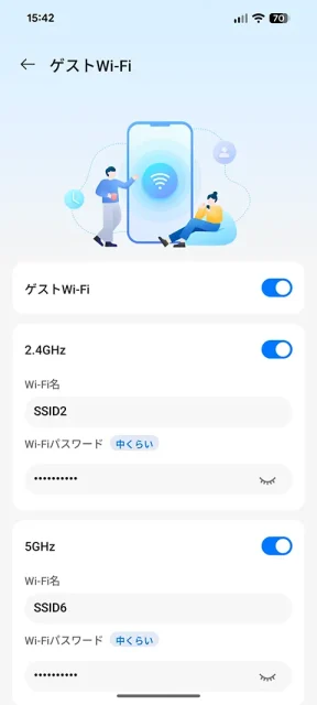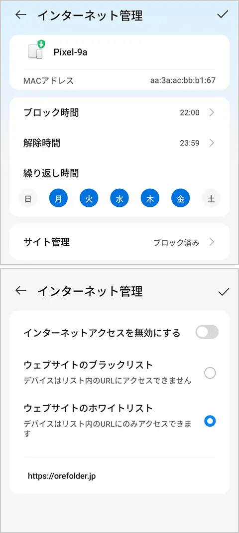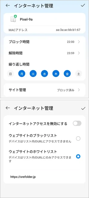 このほか、アプリでは来客用に普段使いとは別の名前のWi-Fiを提供したり、接続するデバイスごとに時間やウェブサイトなどの制限を設定できます。子供用のデバイスでは夜中に制限する、といったことも可能です。