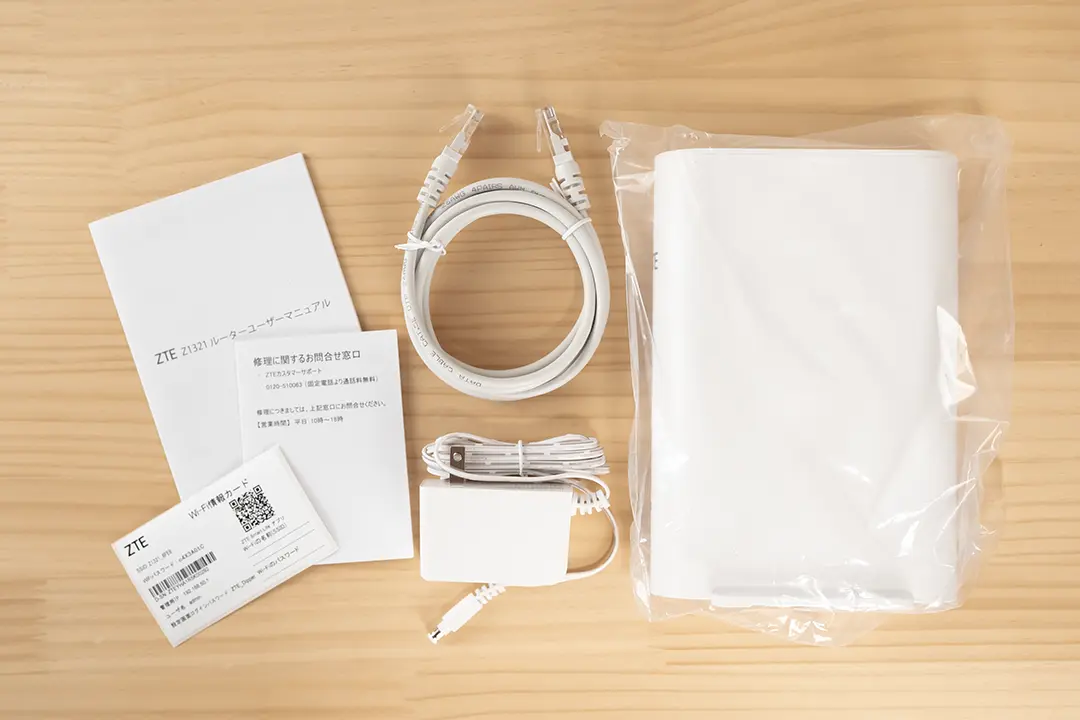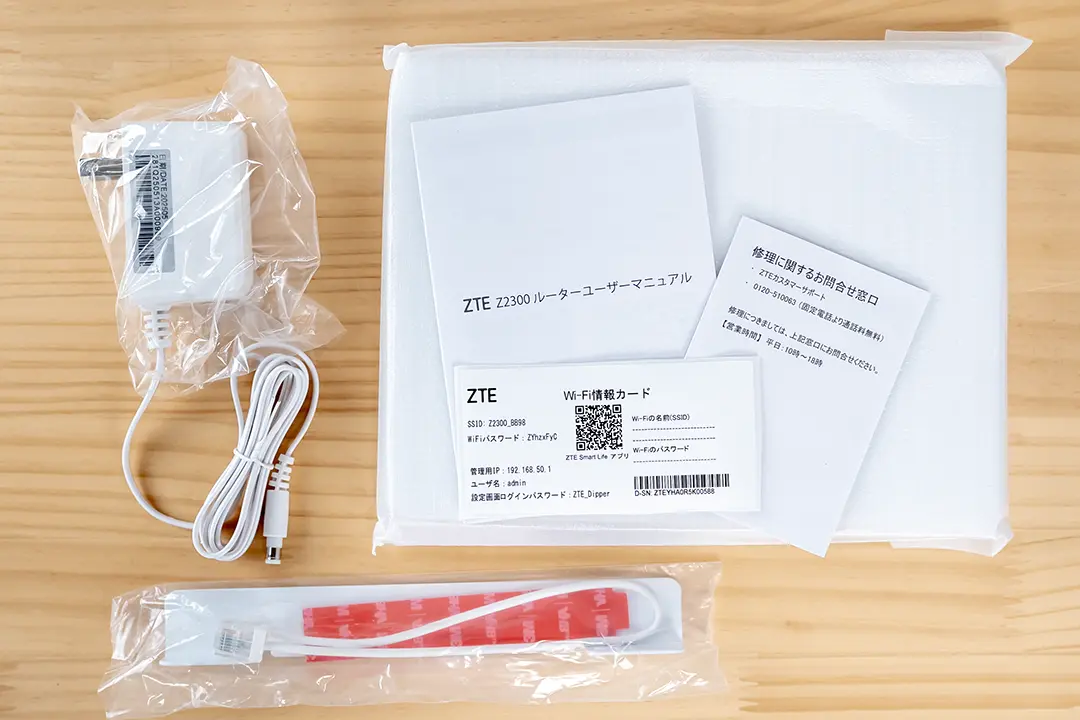 Soraの同梱物はマニュアル類と電源アダプタにLANケーブルです。LANケーブルはCAT5eのものです。