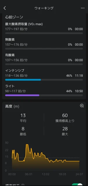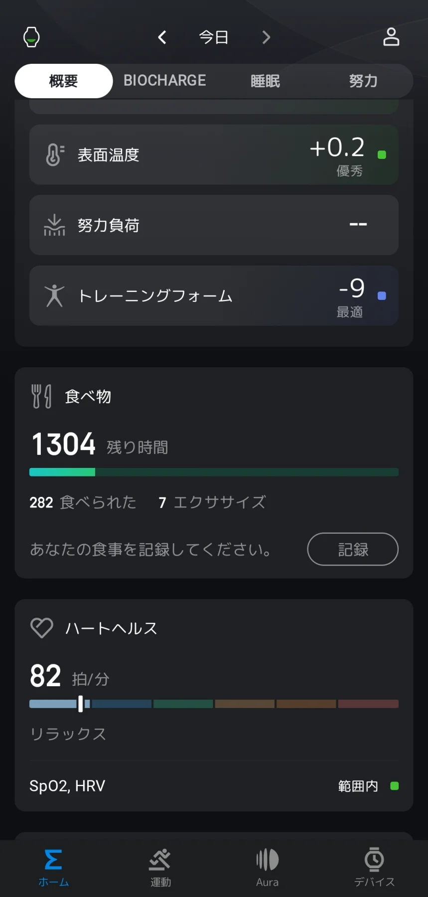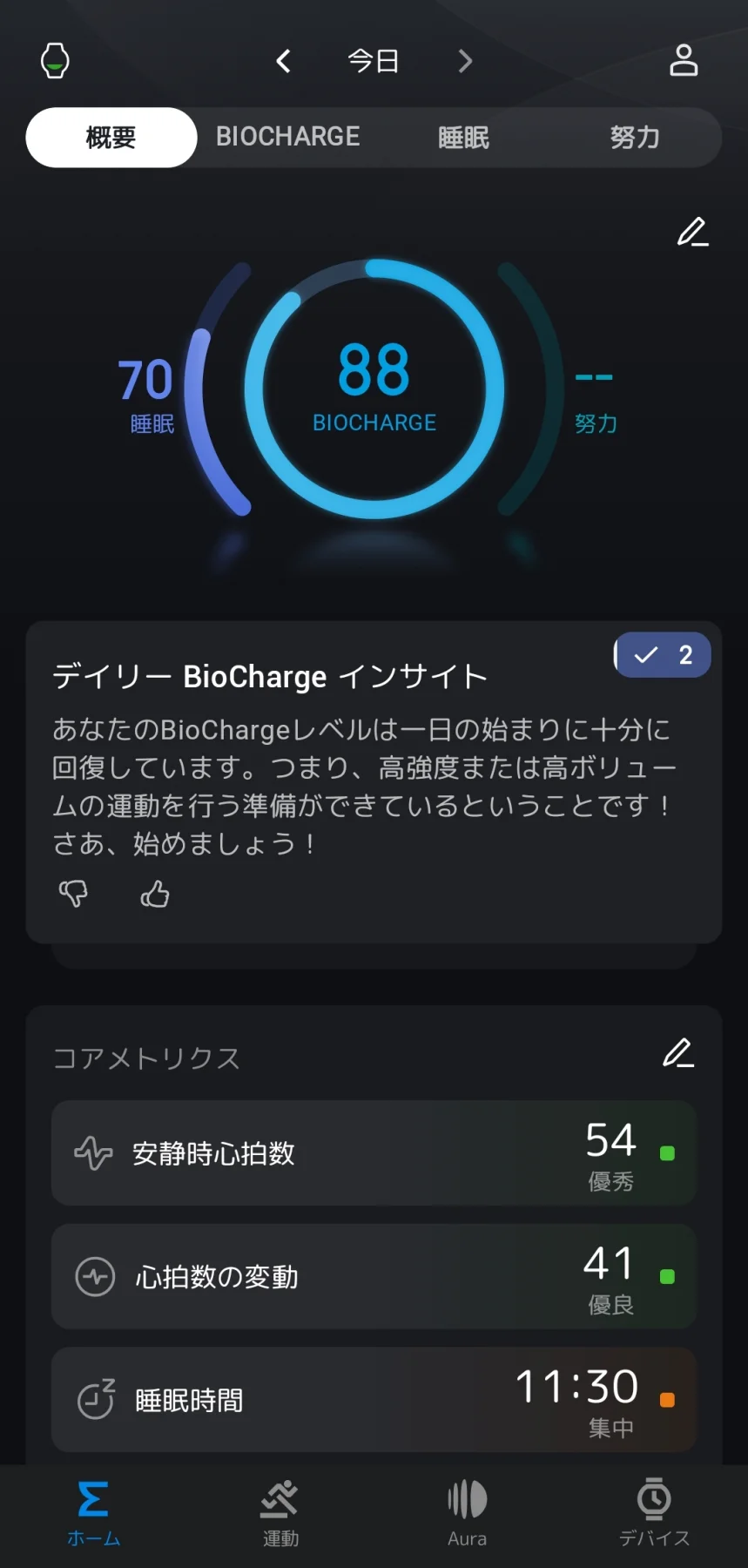 少し前から、このBioChargeという値が表示されるようになりました。これは睡眠スコアのようなものとは異なり、1日の中で上下するスコアです。休息ができていると値が高くなり、睡眠時間が短かったりして休めていないと下がります。