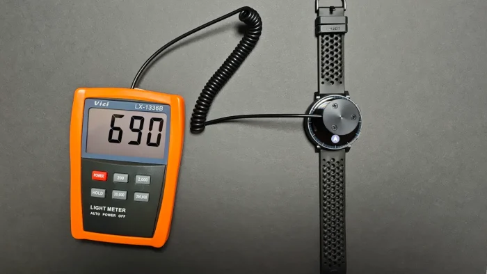 明るさを最大に設定し、懐中電灯モードで輝度を測定したところ、約690nitsでした。