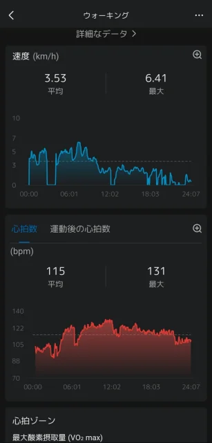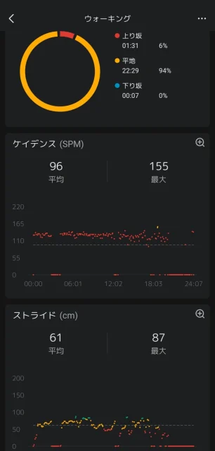 屋外でウォーキングをした時のデータが自動で記録されていました。基本的なバイタルデータなどはこれまでと同様にしっかり取れています。位置情報(GNSS)も正確に記録できていましたが、アーケードの下を歩いているところはちょっとズレていました。