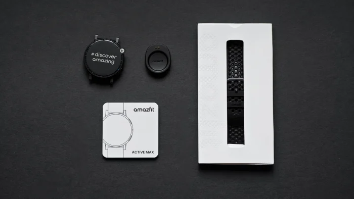 内容物一覧です。Amazfit Active Max本体、バンド、多言語対応の説明書、充電器(ヘッド部分のみ)が入っていました。