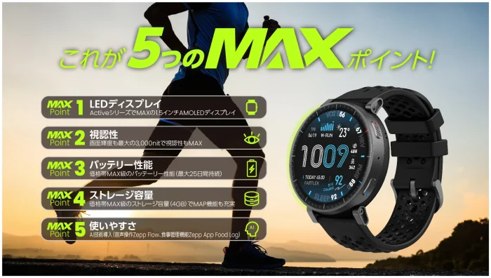 Amazfit Active MaxはAmazfitのメインストリームスマートウォッチのActiveシリーズの最新作で、様々な仕様が“Max”になっています。