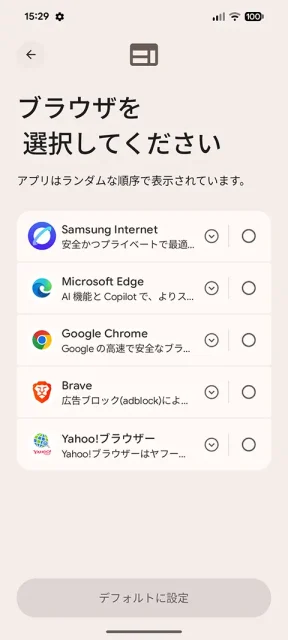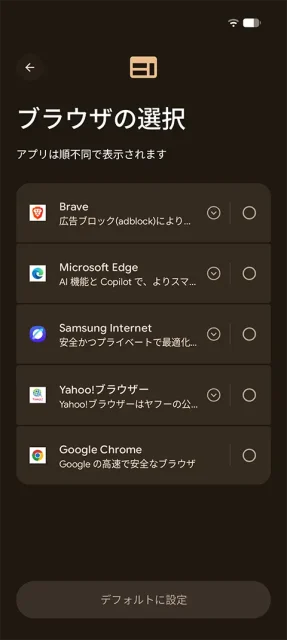 新しいブラウザやホームアプリをインストールした直後はデフォルトアプリが「なし」になるのだから、チョイススクリーンでも「選択しない」という選択肢が欲しかったですね。