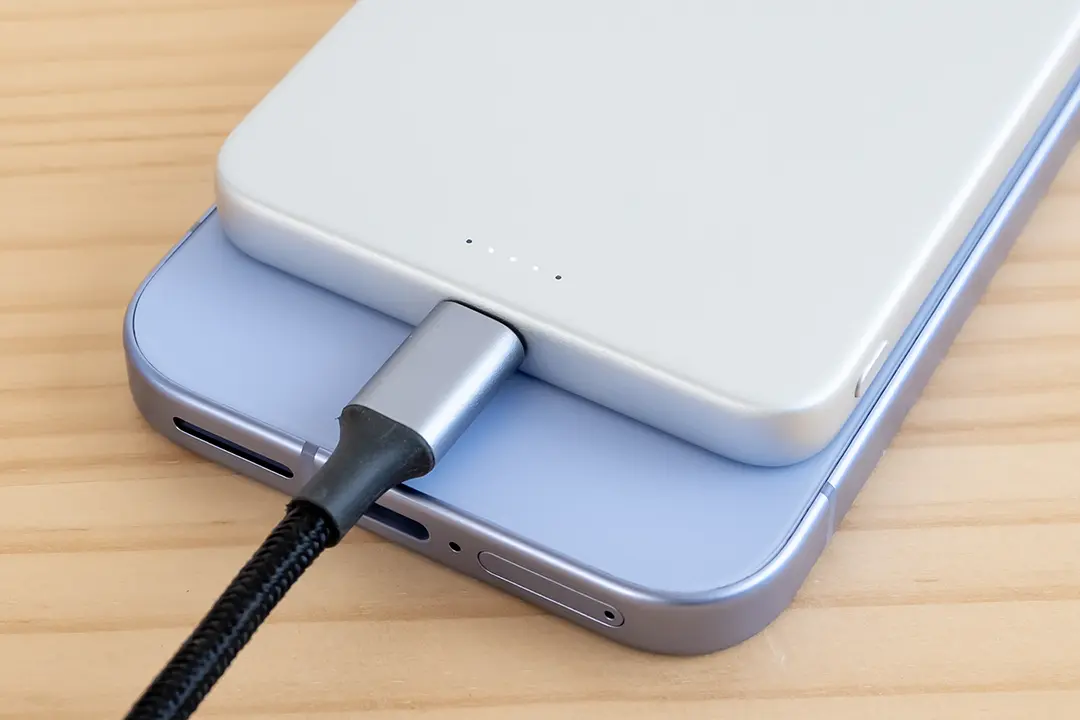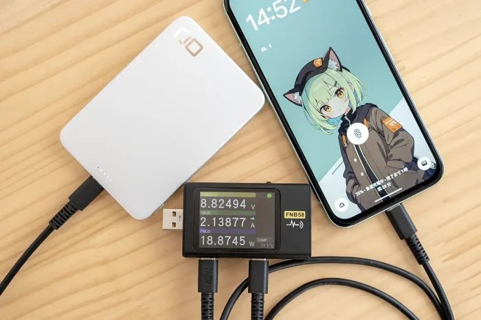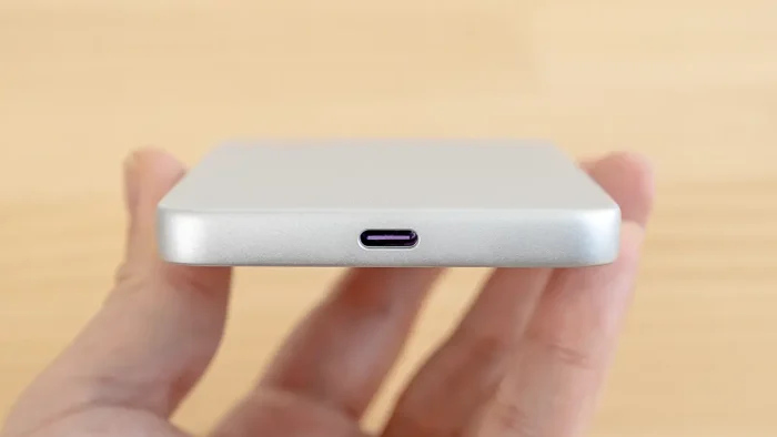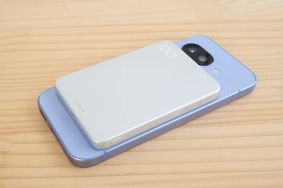 ワイヤレス充電(Qi2)に対応しており、この場合は最大15Wで充電されます。またマグネット対応のスマホ(やケース)であれば、スマホにピタッとくっつけてそのまま充電できます。