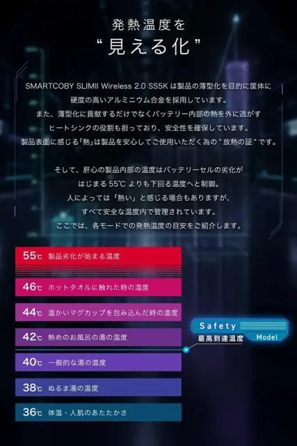 なお、本製品は発熱を抑えながら安定した充電を行う安全重視の「Safety Model」です。内部温度が55℃よりも下回る温度に制御されます。筐体のアルミニウム合金は内部の熱を外に逃がすヒートシンクの役割も担っており、そのため放熱により熱く感じることもあるかもしれません。