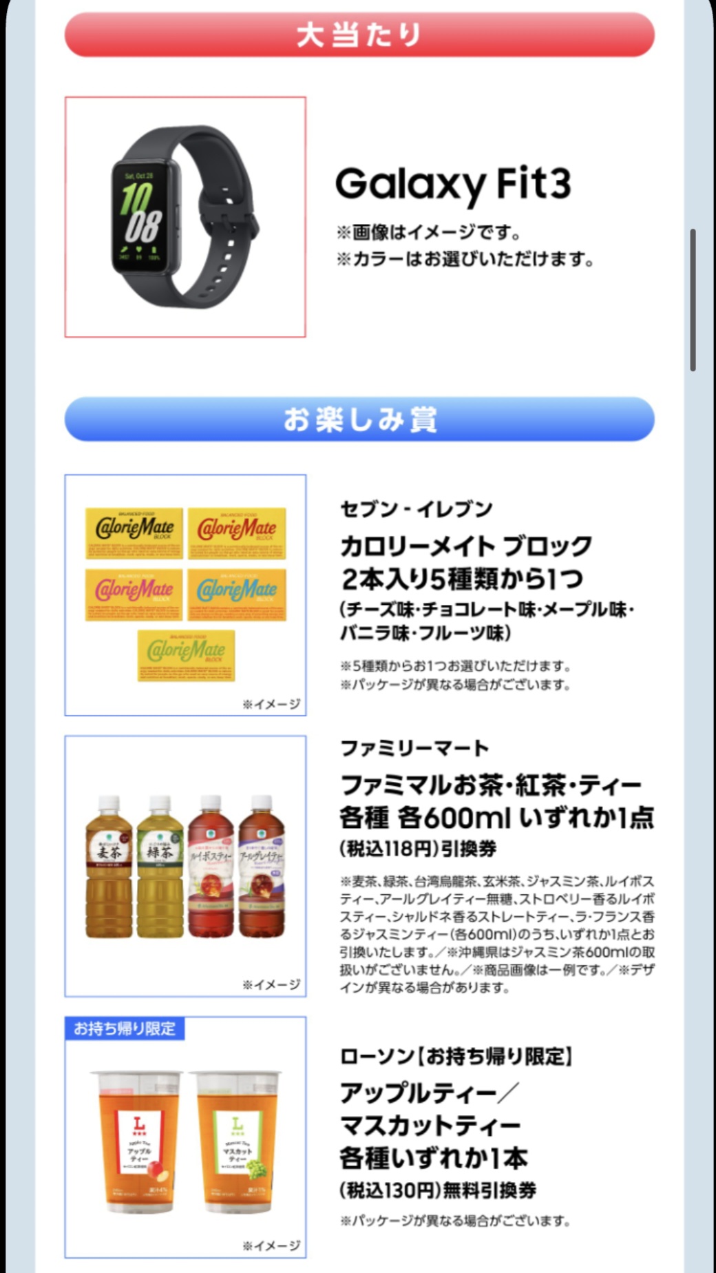 1月のGalaxyスクラッチの特賞はGalaxy Watch8 Classic、大当たりはGalaxy Fit3、お楽しみ賞はコンビニで引き換えられるプチギフトです。