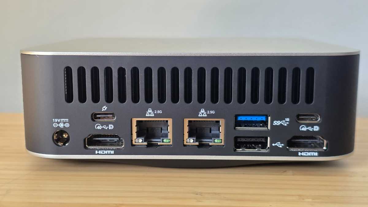 前面にUSB 3.2 Gen2×4、3.5mmジャック、後面にはUSB 3.2 Gen2×1、USB 2.0×1、USB4 Type-C×2、RJ45×2、HDMI 2.0×2が搭載されています。汎用性の高いUSB-A端子が複数搭載されているのは便利です。