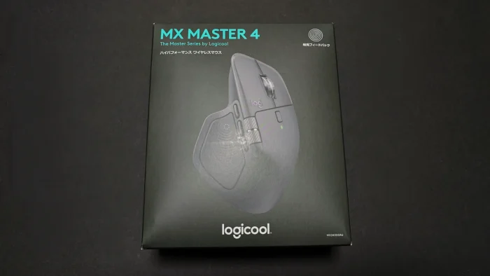 パッケージです。ダークグレーのパッケージには、MX Master 4の写真が大きく載っています。