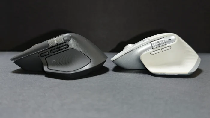 双方、形はかなり似ていて、形状のデザイン的にはさほど違いはありません。その中で最も大きな違いは、水平スクロールホイールの位置でしょうか。MX Master 3Sは凹みの中にはまっているような形でしたが、4では出っ張りの一部分としてホイールが存在しています。また、その水平スクロールホイールの横にあった電源ランプも、上面に位置が移動しています。