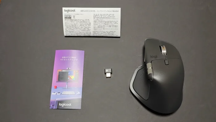 MX Master 4本体です。今回はグラファイトを選択しました。色としてはもう一方のペールグレーが白系で好きなのですが、セール対象ではなかったのと、今使っているMX Master 3Sのペールグレーが経年で黄ばんできていることから妥協してグラファイトにしました。ただ、黄ばみに関しては、MX Master 4は黄ばみにくそうな素材に変わっていたので、ペールグレーにしてもよかったな…と若干後悔しています…