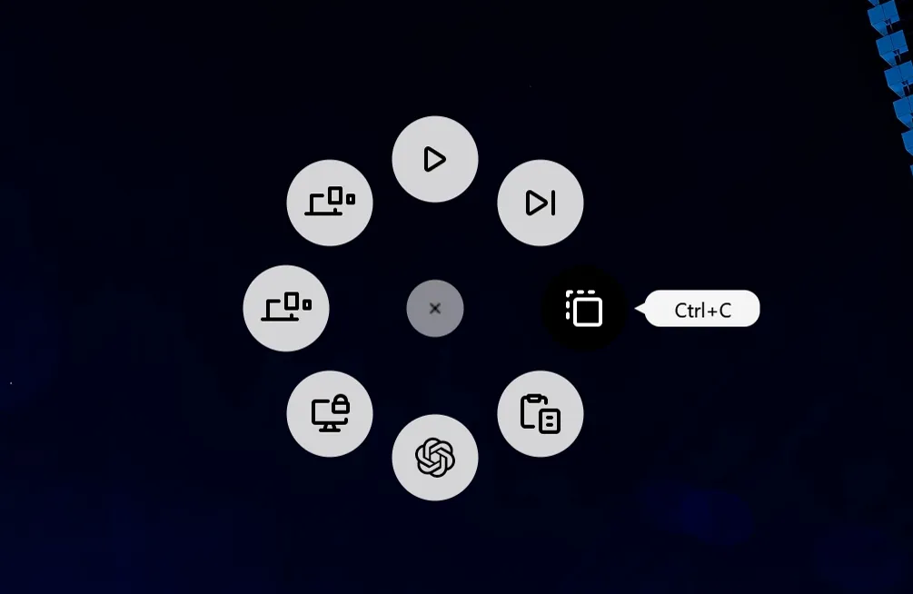 あたかも本当のボタンを押したかのような振動が発生し、画面上に8つの吹き出しが現れ、そのままマウスでカーソルを所望のショートカットにスライドさせ、アイコンの色が変わったところで左クリックをすると、登録された操作が行われます。