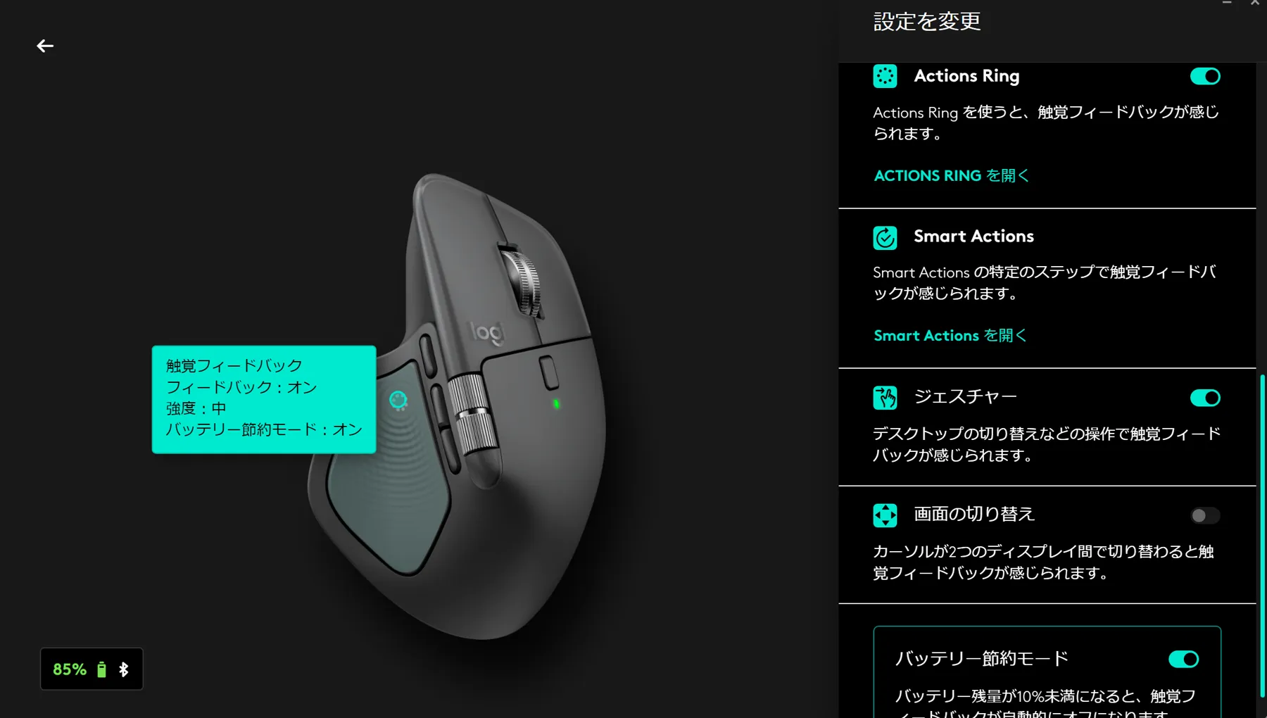 ハプティック(触覚)フィードバックは、MX Master 4から新たに搭載された機能です。MX Master 3Sまでは、Actions Ring自体はあったもののハプティックフィードバックがありませんでした。