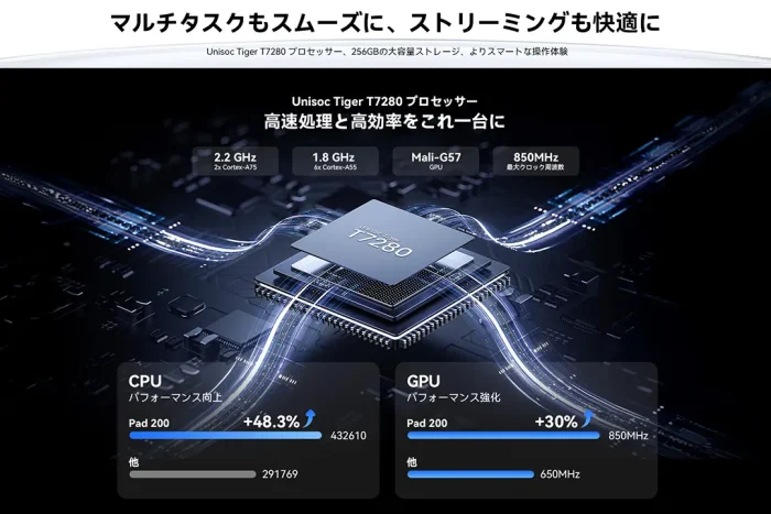 SoCにはUNISOC T7280を搭載。エントリークラスの性能ではありますが、電子書籍や動画鑑賞といった目的であれば十分です。RAMは6GBで最大24GBまで拡張可能。ストレージは128GBと256GBがあり、どちらもMicroSDカード対応です。