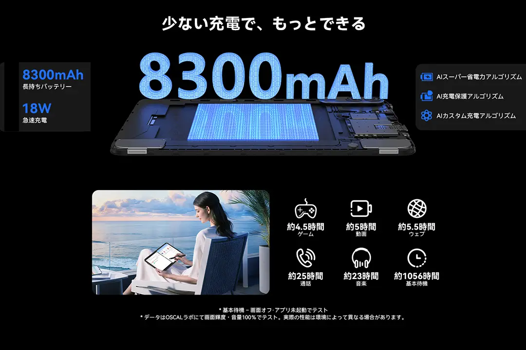 バッテリーは8300mAhとタブレットらしい大容量です。充電では18W対応なのでそれなりの時間で満充電までいけます。