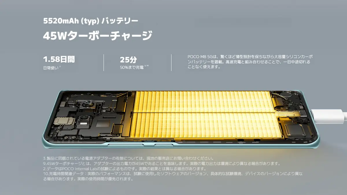 POCO M8 5Gは6.77インチで120Hz駆動のAMOLEDディスプレイのスマートフォンです。エントリー帯のシリーズながらSoCはSnapdragon 6 Gen 3を搭載、バッテリーは5520mAhで45Wターボチャージに対応します。