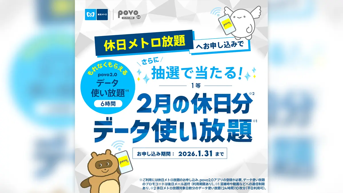 auのオンライン専用ブランドpovoは1月20日より、東京地下鉄(東京メトロ)の会員向けの実質乗り放題サービス「休日メトロ放題」を申し込むとpovoの「データ使い放題(6時間)」1回分のプロモコードがもらえるキャンペーンを開始しました。