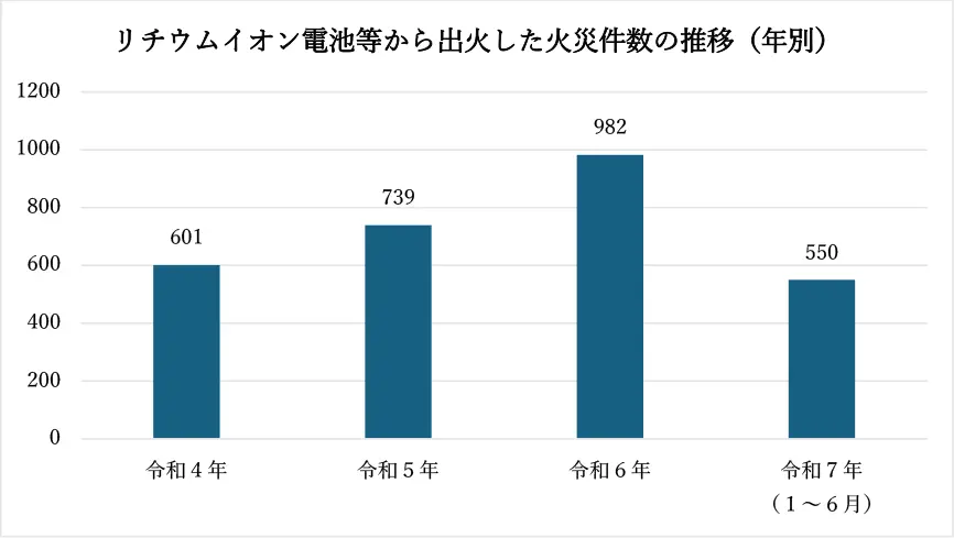 令和4年1月1日から令和7年6月30日の間に発生したリチウムイオン電池(バッテリー等の充電式蓄電池)及びこれを搭載した製品から出火した火災についてのもので、令和4年は601件だったものが令和7年は6月までの半年で550件となっており、急増していることがわかります。