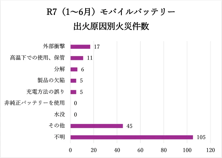 出火原因について、モバイルバッテリーの場合は「外部衝撃」「高温下での使用、保管」が上位となっています。