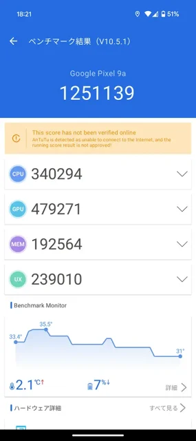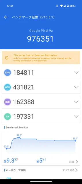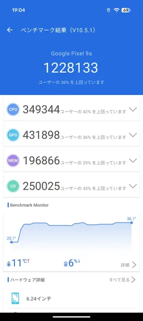 上の画像は同じPixel 9aのテスト結果です。v11.0.8では1,541,748点、v10.5.1では1,228,133点でした。だいぶ変わりますね。