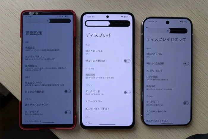 上の画像の3つのスマホはすべて同じ画面フィルムを貼って、画面輝度を50%に設定したものです。実際の明るさは全然違います。これで比較してはダメでしょう。