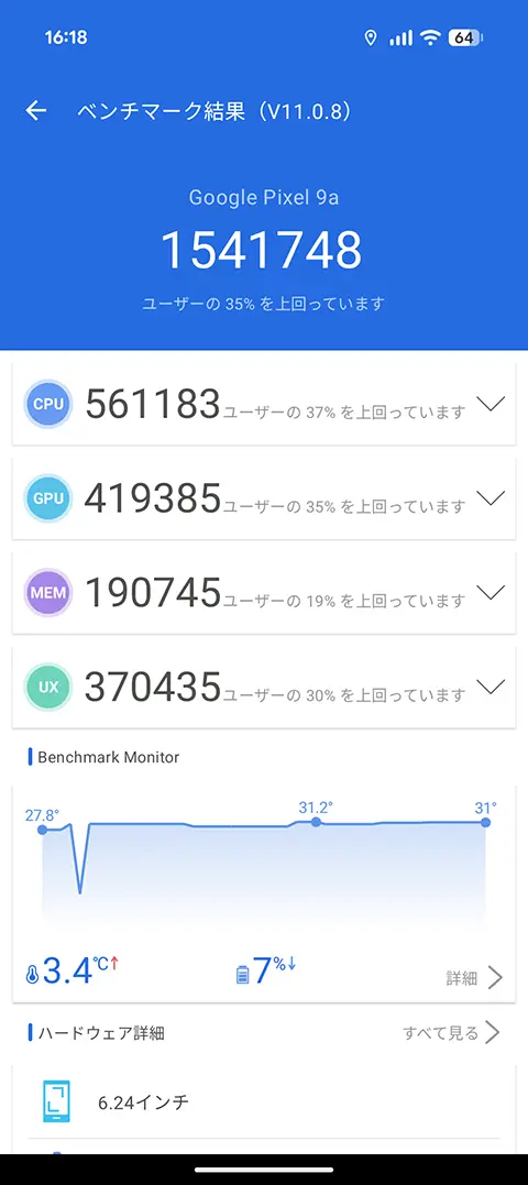 上の画像は同じPixel 9aのテスト結果です。v11.0.8では1,541,748点、v10.5.1では1,228,133点でした。だいぶ変わりますね。
