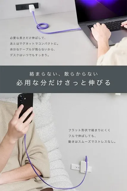 Flex Spiral Cable CtoCは、長さ1mの薄型フラットケーブルをスパイラル状にまとめた、持ち運びやすさと使いやすさを両立するUSB Type-C to Cケーブルです。ケーブル内部にマグネットを内蔵するので自然と渦巻き状にまとまり、コンパクトに収納可能です。