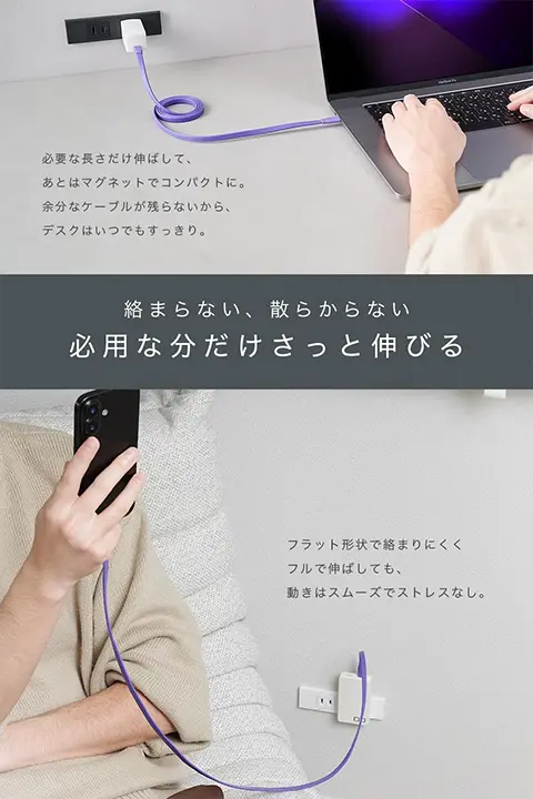 Flex Spiral Cable CtoCは、長さ1mの薄型フラットケーブルをスパイラル状にまとめた、持ち運びやすさと使いやすさを両立するUSB Type-C to Cケーブルです。ケーブル内部にマグネットを内蔵するので自然と渦巻き状にまとまり、コンパクトに収納可能です。