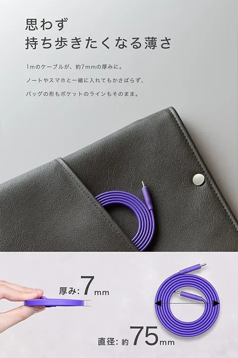 厚さ約7mmのフラット形状によりかさばりにくく、まとまったときの直径は約75mmとコンパクト。バッグやポーチのすき間にもすっきり収まります。