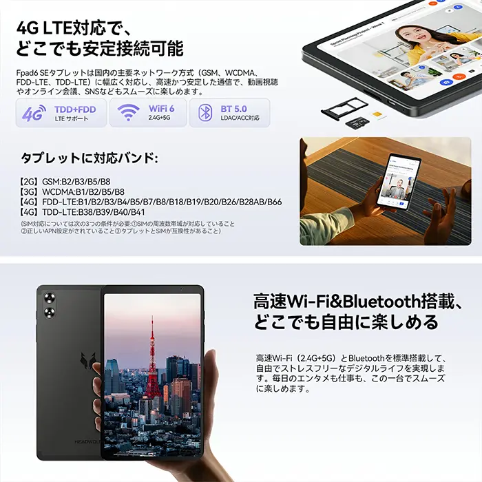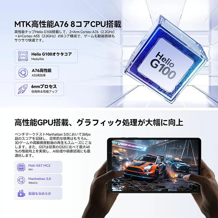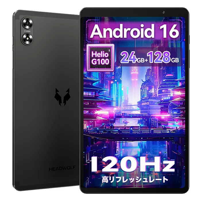 Headwolf FPad6は、8.7インチのコンパクトなAndroid 16タブレットです。SoCにはHelio G100を採用し、日常使いや軽いゲームも快適に動作します。薄型軽量化や長時間バッテリーなど基本性能が向上されており、WidevineL1に対応、デュアルスピーカーも搭載します。SIMフリーでLTE通信もでき、電子書籍や動画視聴にもぴったりです。