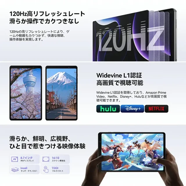| ディスプレイ | 8.7インチ 1340×800 (HD+) リフレッシュレート:120Hz |