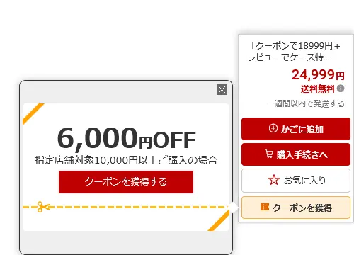 キャンペーン期間中はクーポンで6,000円引きになり18,999円で購入できます。また、レビュー投稿で専用ケースがもらえます。