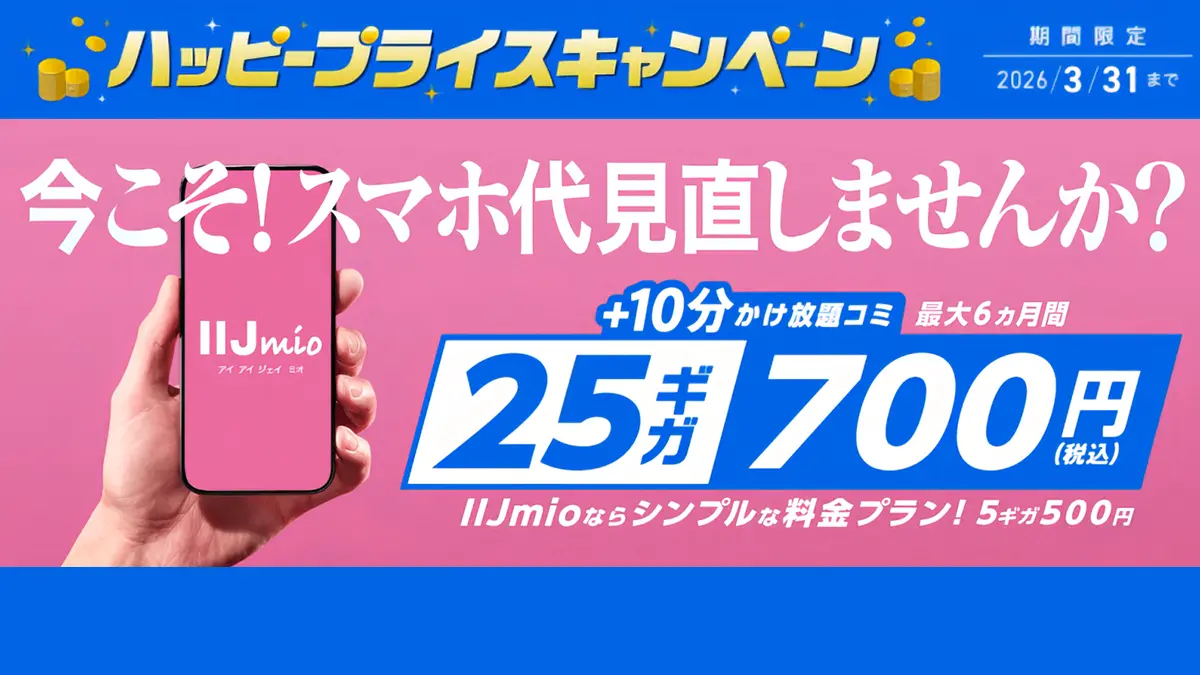 格安SIMのIIJmioは2月3日より、ギガプランをおトクに利用できる「ハッピープライスキャンペーン」を開始しました。月額料金割引のほか、データ増量や通話定額オプション割引といった特典があります。