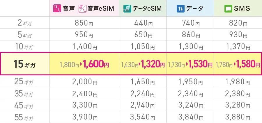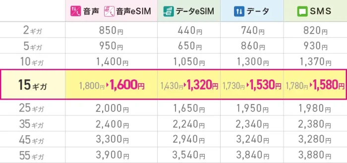 今回改定(値下げ)されるのはギガプランのうち15ギガのみです。音声SIMと音声eSIMは月額1,800円から1,600円、データeSIMは1,430円から1,320円、データSIMは1,730円から1,530円、データ+SMSは1,780円から1,580円になります。なお、すでに利用中の場合は自動で新料金が適用されます。